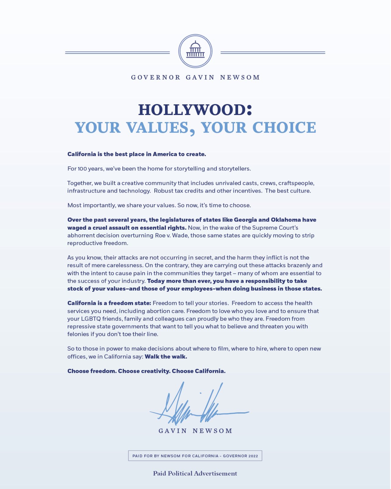 Gavin Newsom On Twitter Today Hollywood Will Wake Up To This Ad Time To Choose You Can Protect Your Workers Or Continue To Support Anti Abortion States That Rule With Hatred We Re Here